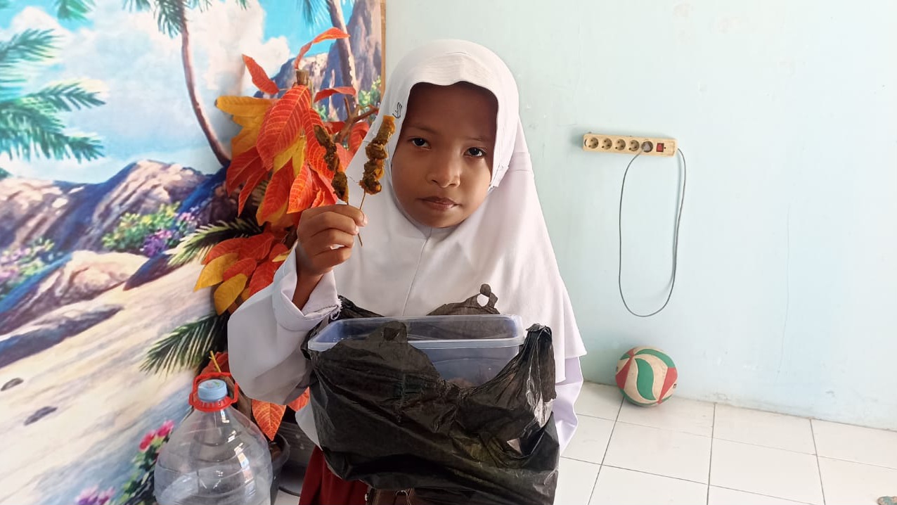 Di sana, di antara keriuhan bocah-bocah berseragam yang berkejaran, tampak Khoenunisa berdiri dengan tenang. Bocah perempuan berusia 11 tahun itu bukan sekadar sedang jajan. Jemari kecilnya tampak cekatan menyusun tusuk-tusuk sate, membantu sang nenek menyiapkan dagangan sebelum bel sekolah memanggilnya masuk ke ruang kelas.
