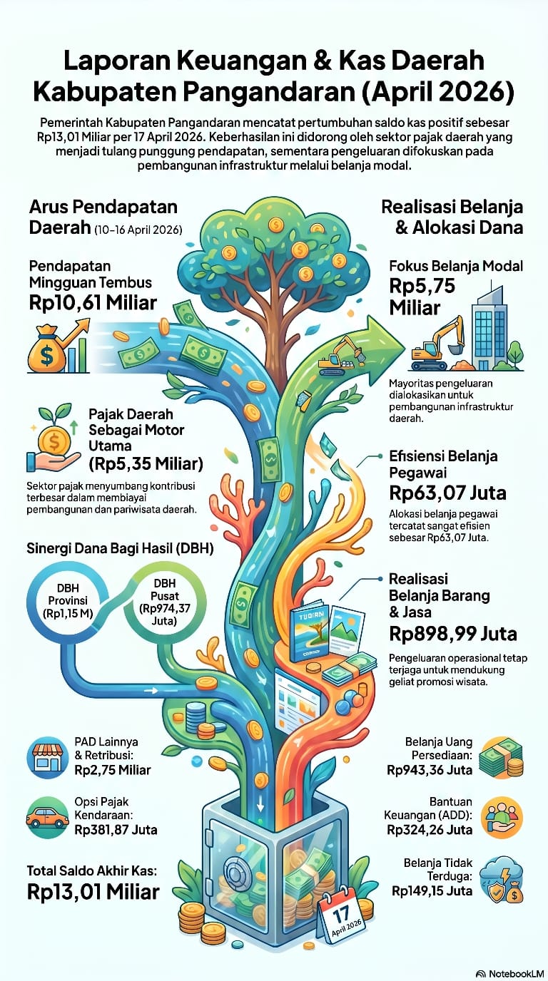 PANGANDARAN, CEKBER.com – Pemerintah Kabupaten (Pemkab) Pangandaran melaporkan posisi saldo kas umum daerah yang mencapai Rp 13,01 miliar per Jumat 17 April 2026. Angka ini menunjukkan pertumbuhan positif dibandingkan saldo awal pada periode 10 April 2026 yang tercatat sebesar Rp 10,52 miliar.