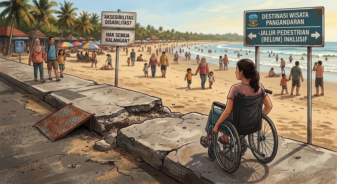 PANGANDARAN, CEKBER.com – Di balik klaim manis Pemerintah Kabupaten (Pemkab) Pangandaran sebagai destinasi wisata unggulan di Jawa Barat, tersimpan kenyataan pahit bagi para penyandang disabilitas. Alih-alih menjadi “surga bagi semua,” jalur pedestrian di Pantai Pangandaran justru menjelma menjadi rintangan fisik yang mengabaikan hak-hak dasar kelompok rentan.