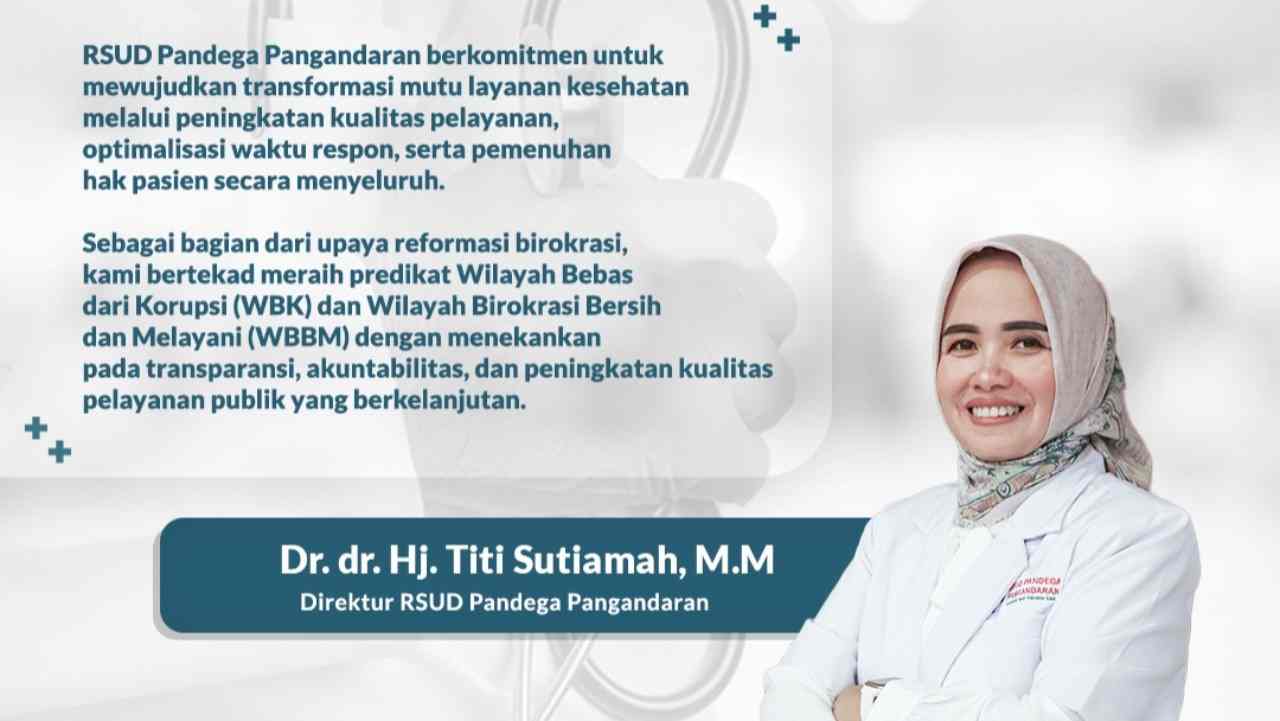 Direktur RSUD Pandega Pangandaran, Dr. dr. Hj. Titi Sutiamah, M.M, menegaskan, reformasi birokrasi di lingkungan rumah sakit bukan sekadar slogan, melainkan gerakan nyata untuk membangun sistem pelayanan yang profesional, transparan dan berorientasi pada kepuasan masyarakat.